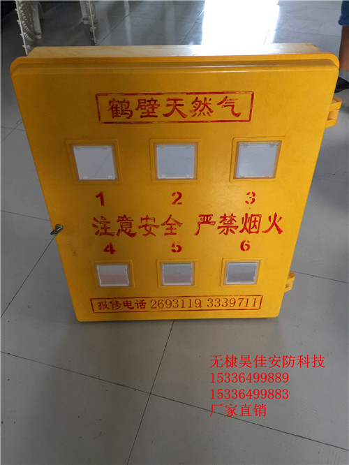 组合一位SMC玻璃钢燃气表箱的箱体正面装有箱门,箱门上设有观察孔,观察孔装有注塑而成的聚 碳有机玻璃块或玻璃块,观察孔专为方便插卡换电池设计,根据实际需要可生产为活动滑块或固定观察孔。箱门与箱体的连接采用整体的合页与锁鼻法兰,配备燃气 专用锁,箱体上设有进气管安装孔和出气管安装孔,箱体不设后盖板,进气管安装孔和出气管安装孔在燃气表箱施工现场临时开设或按客户设计好的位置出厂前进行 开孔。表箱制作完成后,根据客户需要,在适当位置喷涂相关标识及电话等。